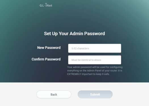 Open a web browser (we recommend Chrome, firefox) and visit http://192.168.8.1. You will be directed to the initial setup of the web Admin Panel.